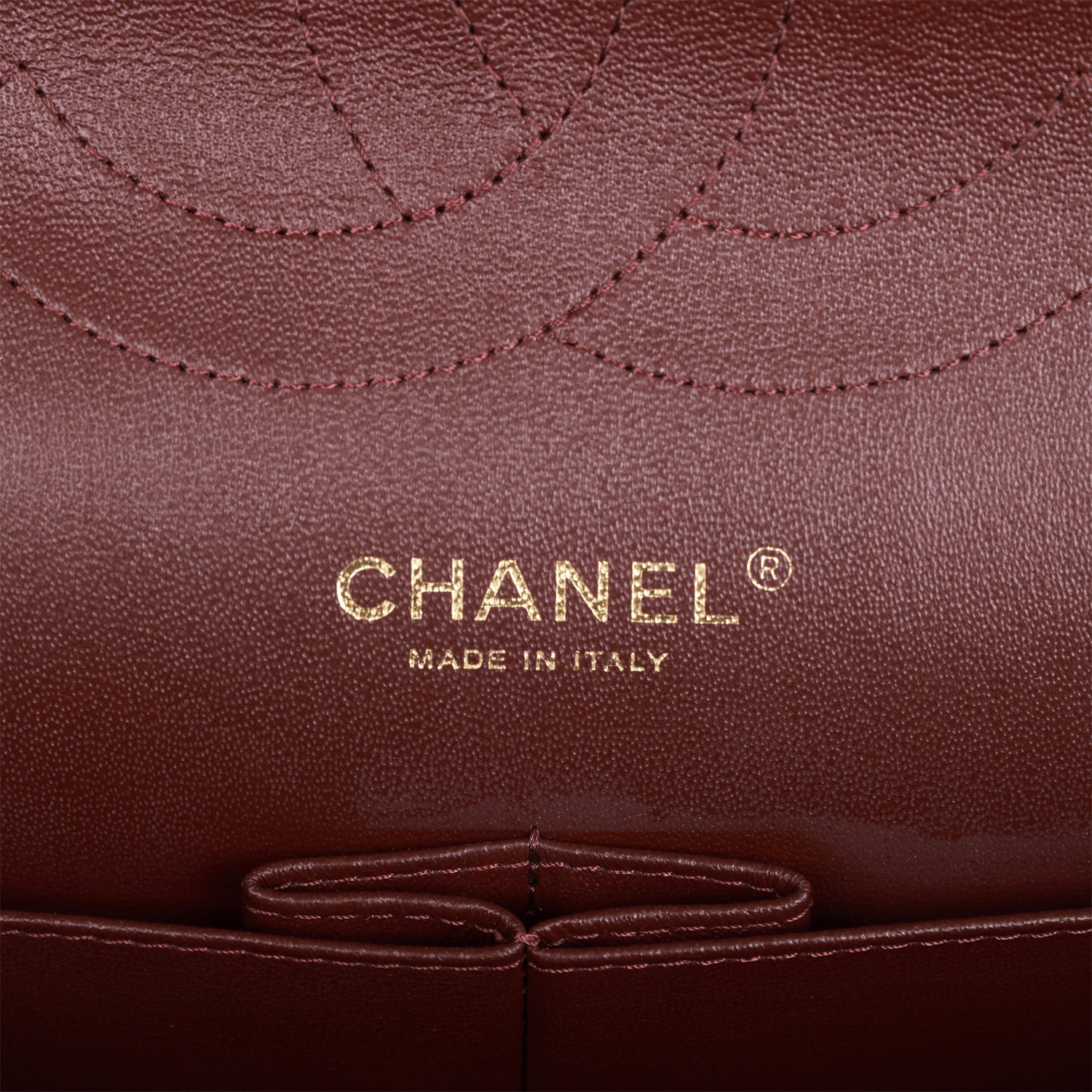 The interior is lined in burgundy leather with a "love letter" zipper compartment under the first flap. an"outer" slit pocket under the second flap. and an?interior compartment with two open pockets separated by a "lipstick" compartment.