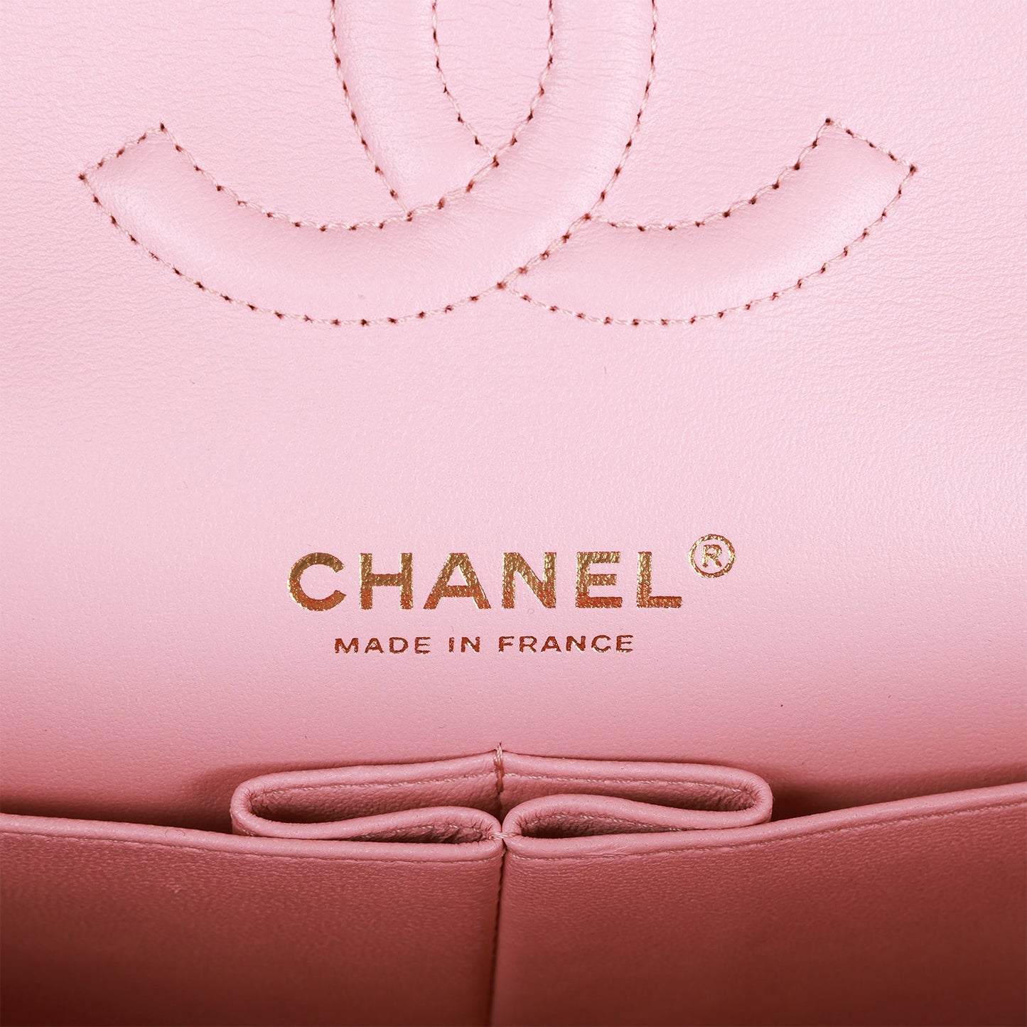 This Medium Classic Double Flap bag is in rose sakura tweed with light gold tone hardware and features a front flap with signature CC turnlock closure. half moon back pocket. and adjustable interwoven light gold chain link and pink leather shoulder strap.
