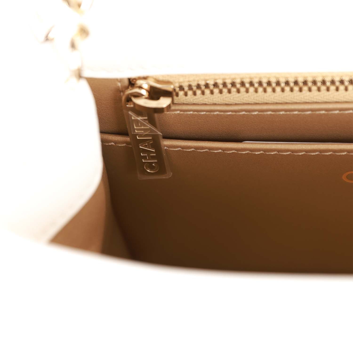 The interior is lined in gold leather and features a zipper pocket with CC pull and an open pocket below.