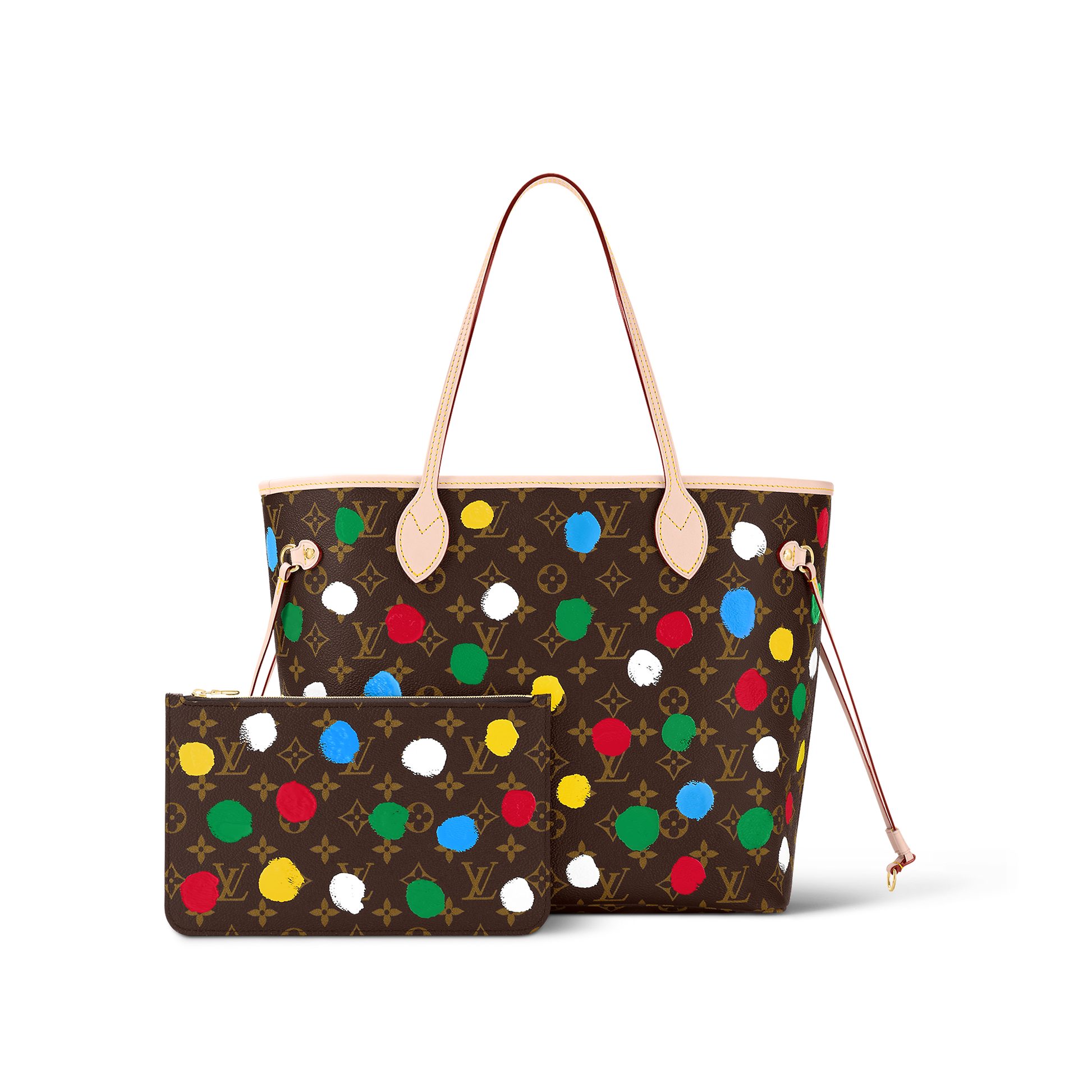 The spacious and elegant LVxYK Neverfull MM tote joins the “Painted Dots” theme as part of the new L x Yayoi Kusama collaboration. Monogram canvas is decorated with the renowned Japanese artist’s signature dots. a unifying element in her work. A complex screen-printing process gives the colorful dotted pattern a 3D relief effect. adding a burst of vibrant energy to a practical carryall.