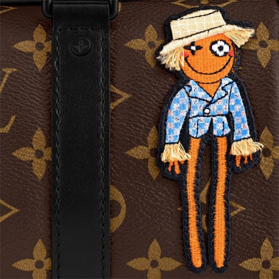 A compact version of the House's original soft travel bag from 1930. the Keepall XS bag for men pairs Monogram canvas with black matte leather. The classic L look is enlivened with a touch of florescent orange along the zipper and an embroidered patch of a cartoon friend from Virgil Abloh's "Zoom with friends" animated film.