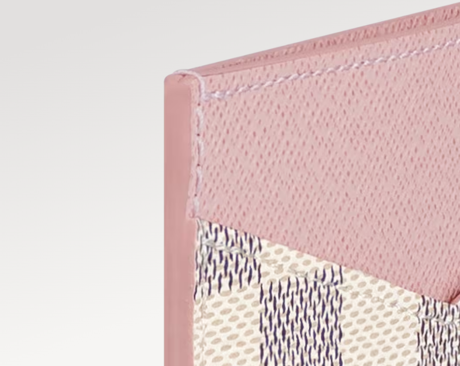 The Daily Card Holder is crafted from Damier Azur canvas with a distinctive V-shaped cutout on both sides revealing its colored leather lining. Small enough to fit into any pocket or bag, it offers two side slots and a larger central slot, which are ideal for credit cards, transport passes or business cards.