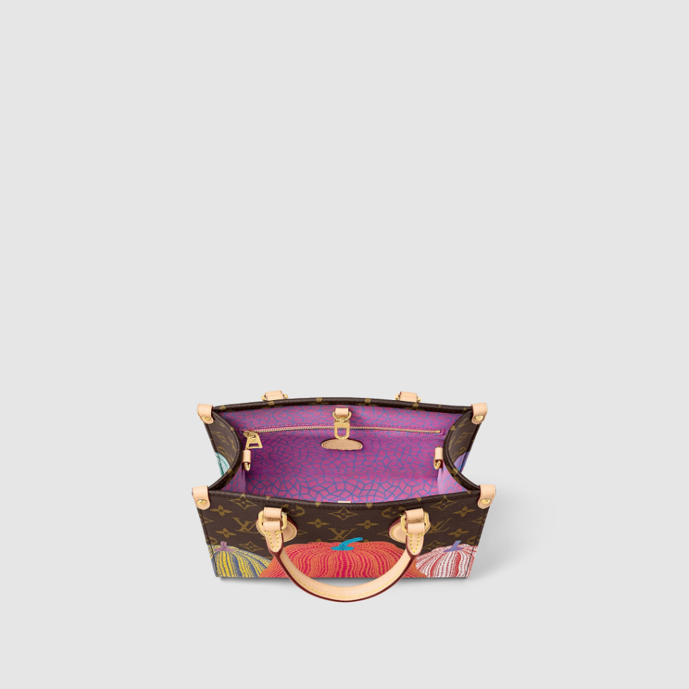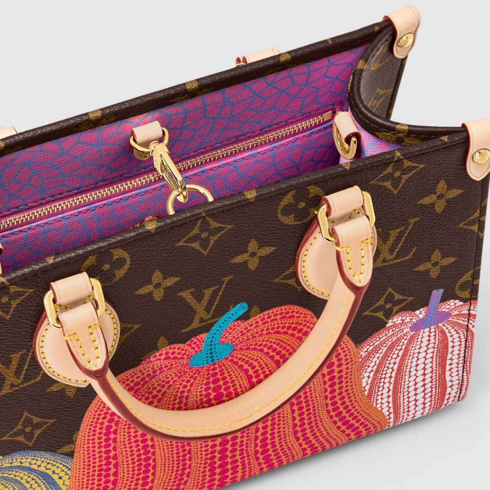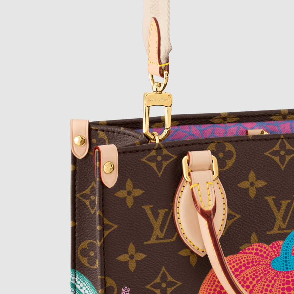 For the L x Yayoi Kusama collection. the LVxYK OnTheGo PM captures the spirit of the Japanese artist’s work with a unique and creative print. Kusama has made pumpkins a visual signature. an emblem of her irrepressible energy and enthusiasm. For this user-friendly bag. Monogram canvas is embellished with a series of pumpkins in warm colors. And it comes with a separate pumpkin-print coin purse on the strap.