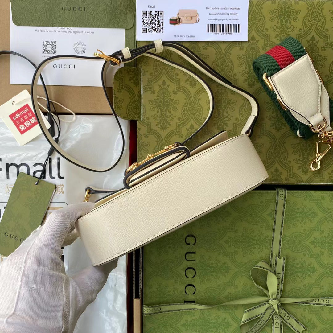 Petite versions of the Gc Horsebit 1955 add a hybrid twist to the vintage inspired line. Enriched with two different shoulder straps. the white leather mini bag's character transforms from understated elegance with a tonal leather strap to a strong logo feel thanks to a red and green Web option.