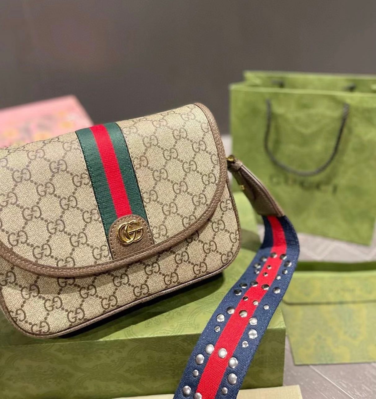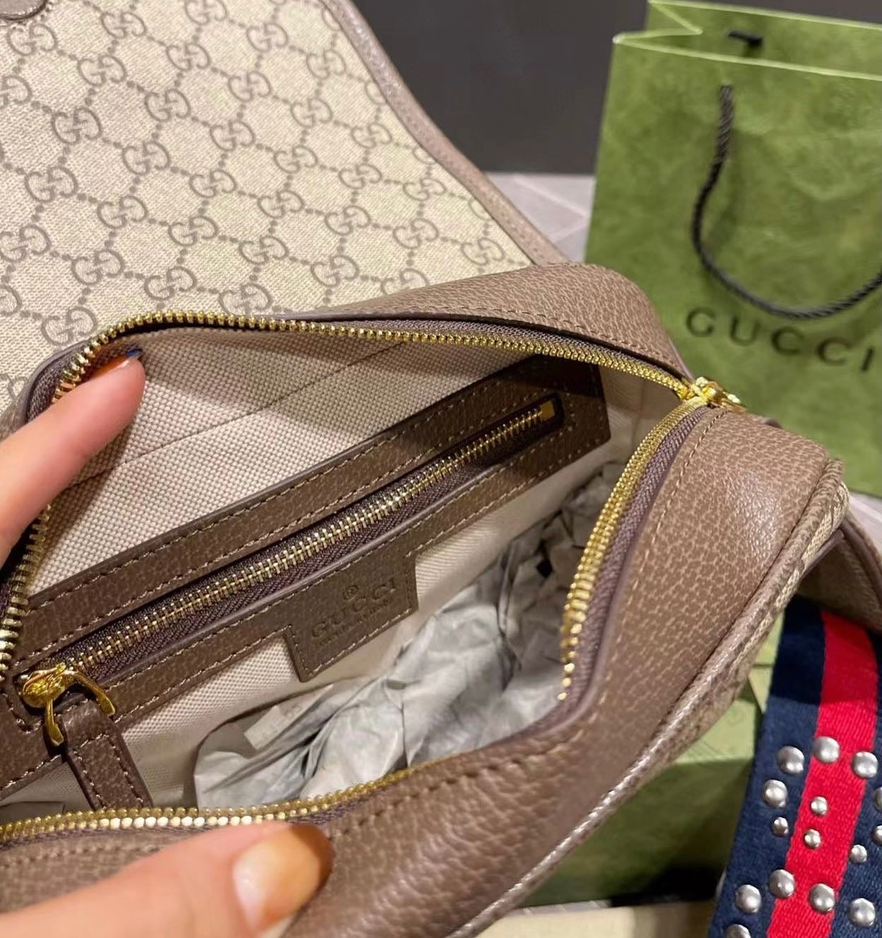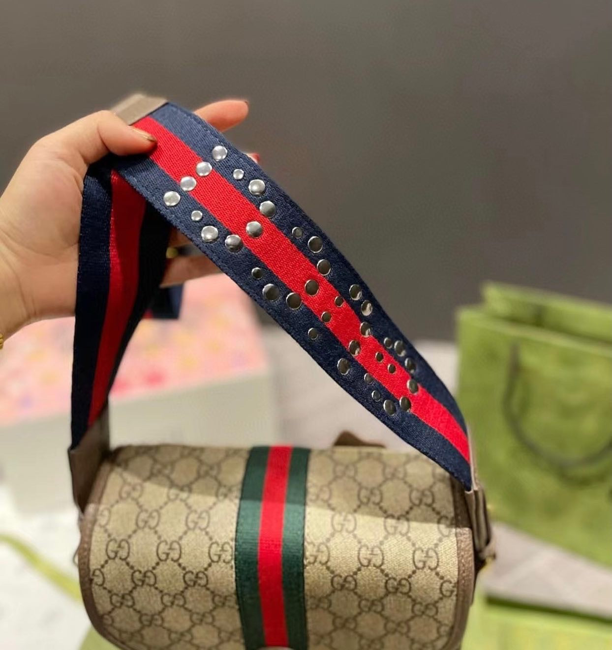 The Ophidia is reinvented in new and unexpected ways. Reminiscent of the punk scene. metal eyelets and studs define the historical silhouette to create a one-of-a-kind take on the archival style. Creating a playful contrast. the mini-sized shoulder bag is crafted from the House's signature GG Supreme canvas in the traditional color combination of beige and ebony.
