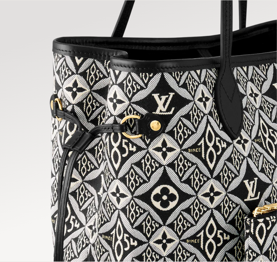 For Winter 2020. the House's classic Neverfull MM tote is made from Nicolas Ghesquière’s new signature textile: a modern pattern featuring many of the House’s symbols. Inspired by wallpapers from the 1960s. Monogram Flowers and Initials are combined with 1854s. the year L started his company. to create a pattern with a neo-vintage feel.