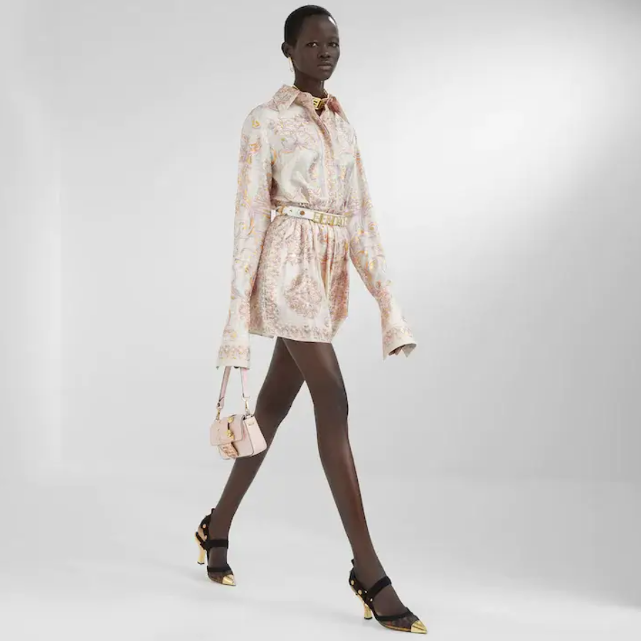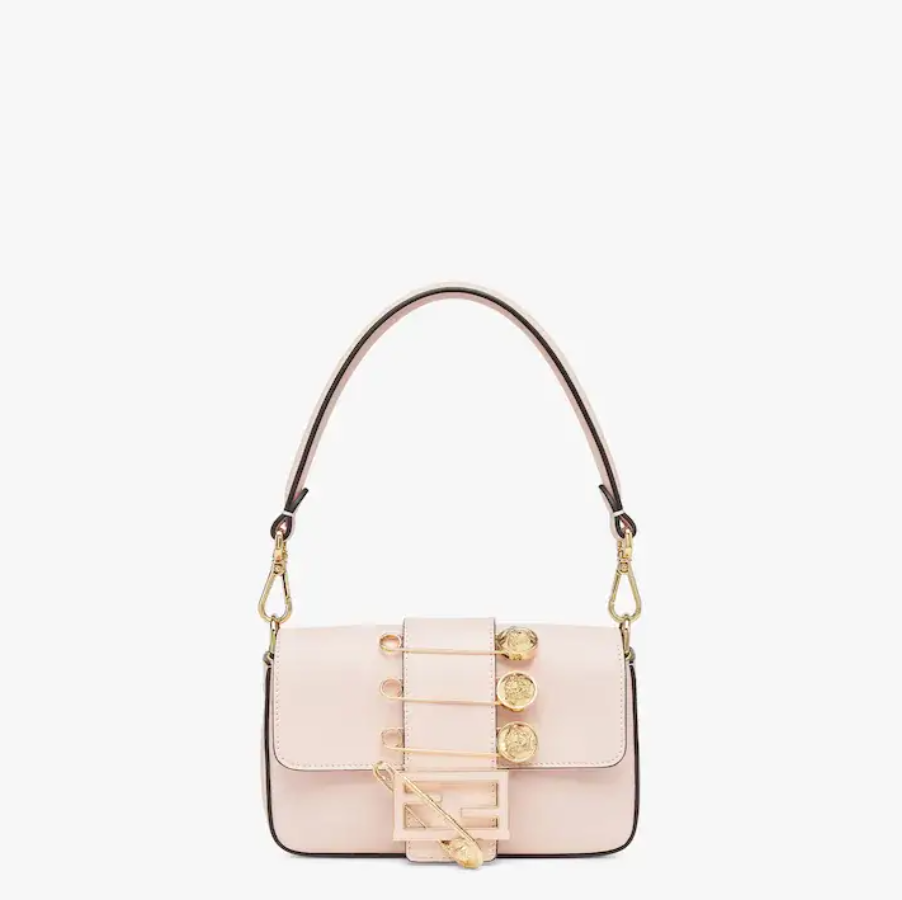 Iconic. boxy mini Baguette bag from the Versace by Fd collection. Made of gold-colored leather with FF motif gold laser-cut perforations that create an effect that evokes the Versace metal mesh. Embellished with three Medusa safety pin brooches on the front flap. FF closure embellished with a brooch.