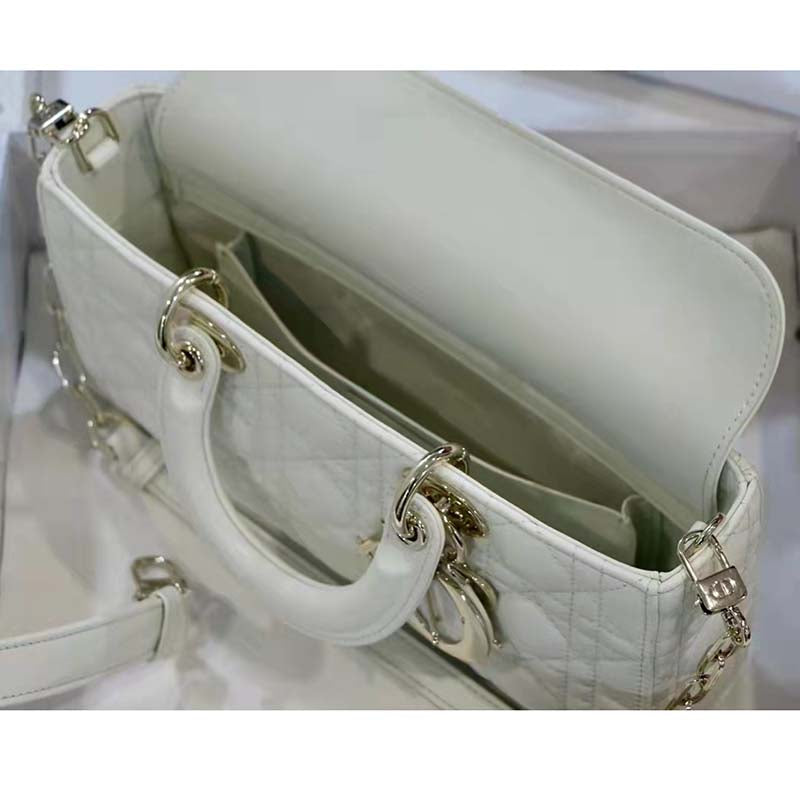 Crafted in latte lambskin with Cannage stitching. the refined and timeless style is enhanced by pale gold-finish metal ‘D.I.O.R.’ charms elegantly embellishing its silhouette.