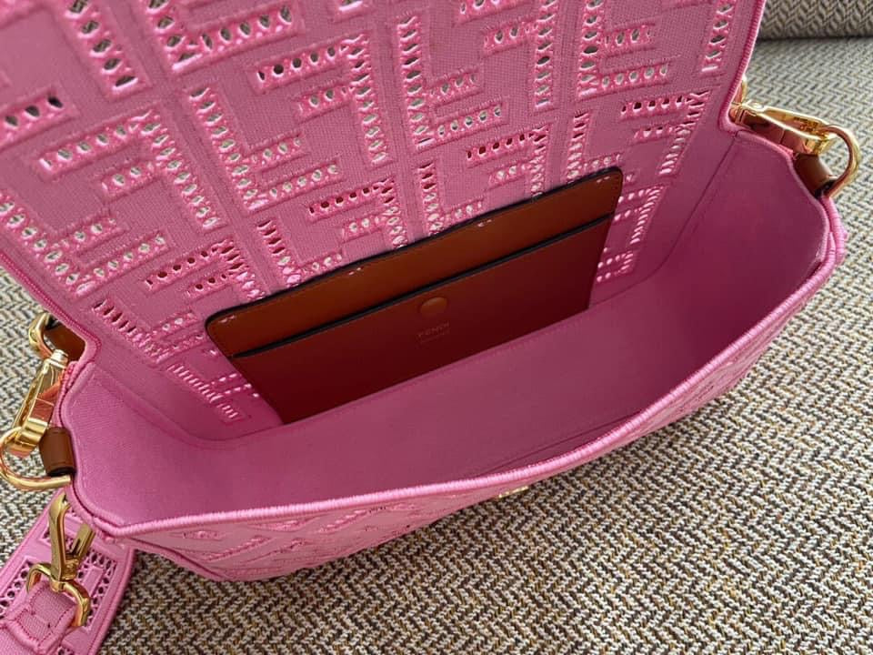 Iconic mini Baguette bag made of undyed canvas with �� jour embroidered FF motif. Finished with natural leather details and embellished with an FF clasp.