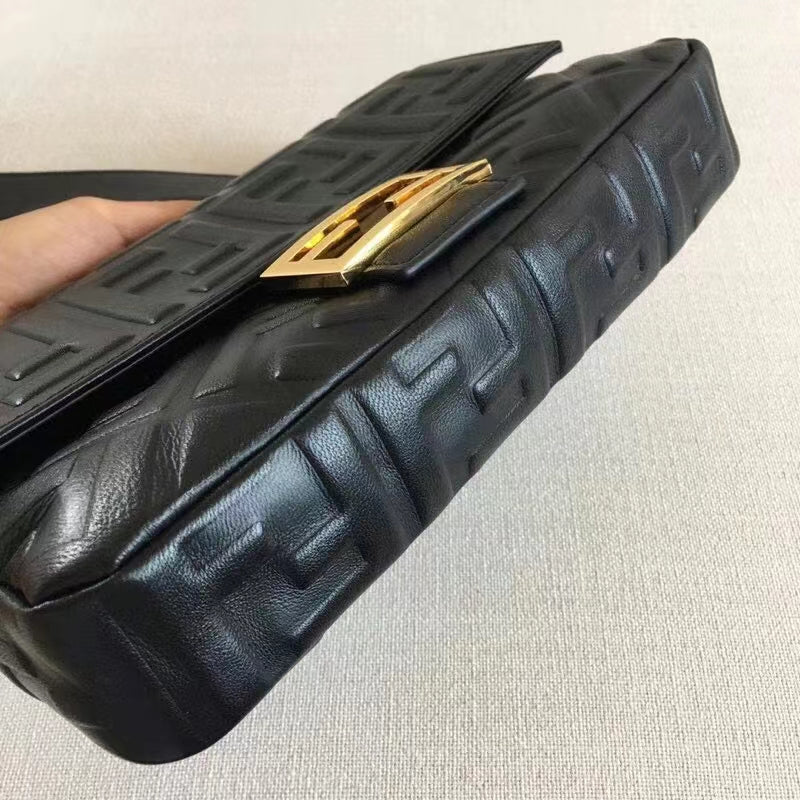 Iconic medium Baguette bag with chain. made of black soft nappa leather with a 3D texture FF motif.