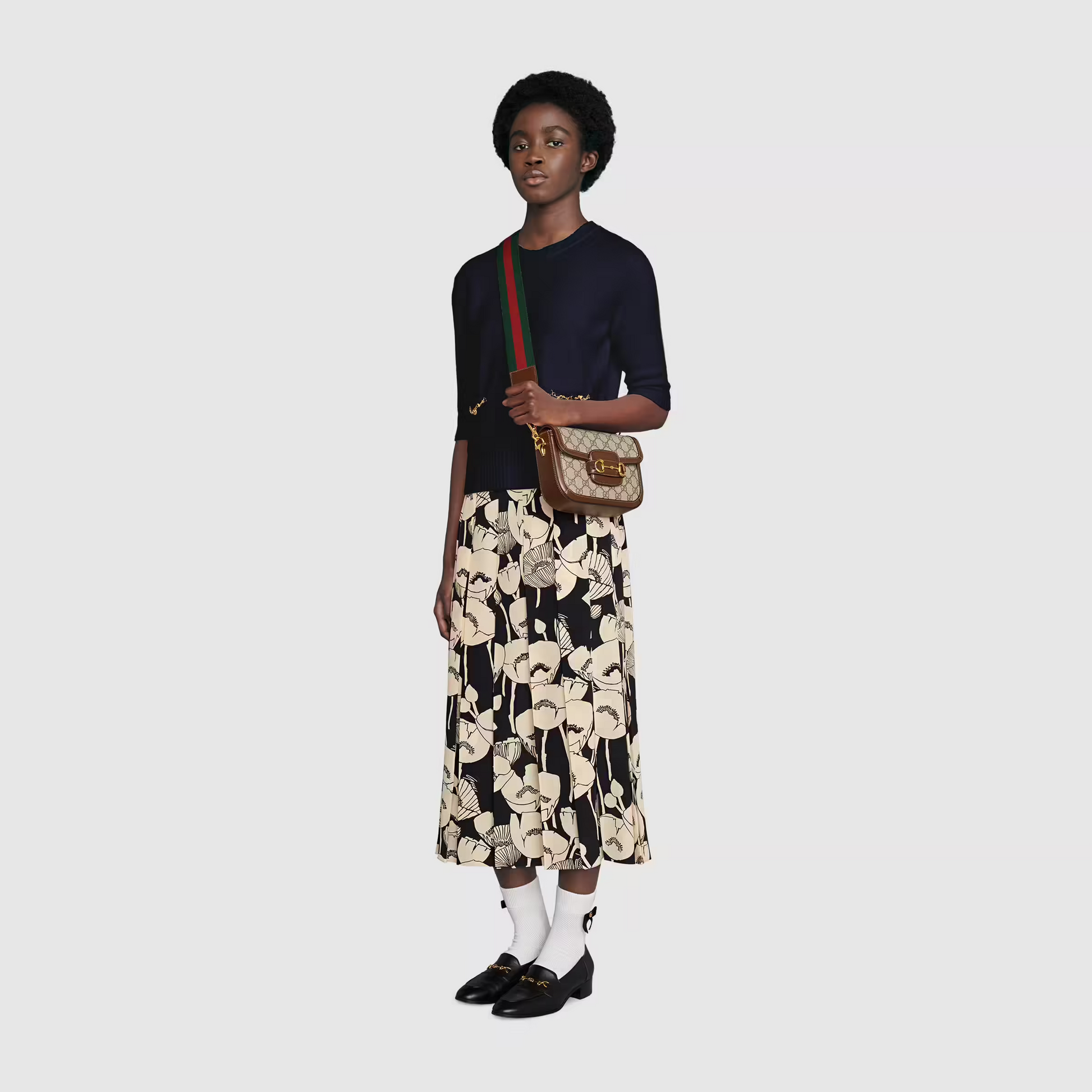 Petite versions of the GG Horsebit 1955 add a hybrid twist to the vintage inspired line. Enriched with two different shoulder straps. the mini bag’s character transforms from understated elegance with a tonal leather strap to a strong logo feel thanks to a red and green Web option. The accessory is presented in monogram canvas with a brown leather trim.