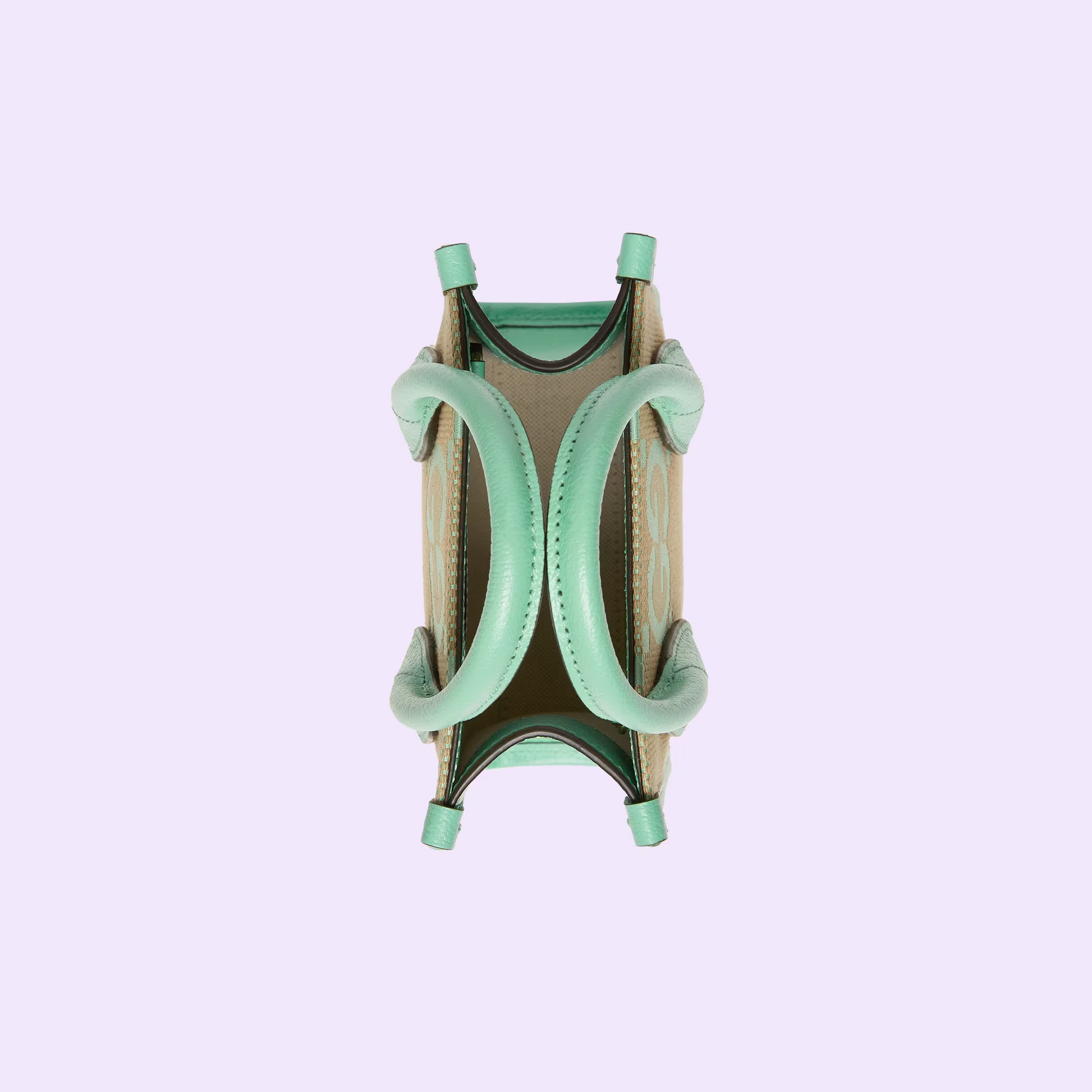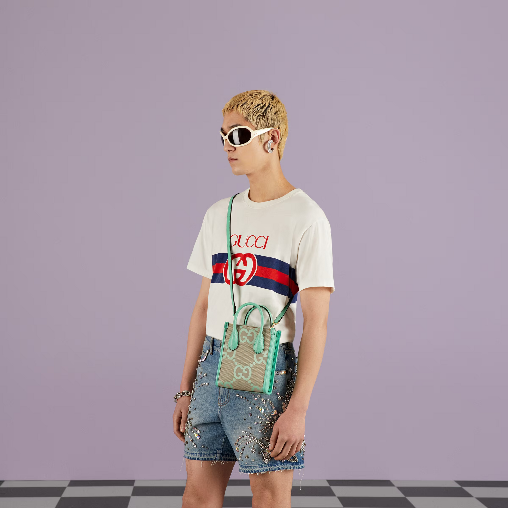 Timeless luggage pieces evolve with the playful transformation of the jumbo GG print. Here the unmistakable jacquard returns with an allover motif. while the signature Interlocking G emblem sits centrally atop a leather label. A green mint leather trim completes this mini tote bag.