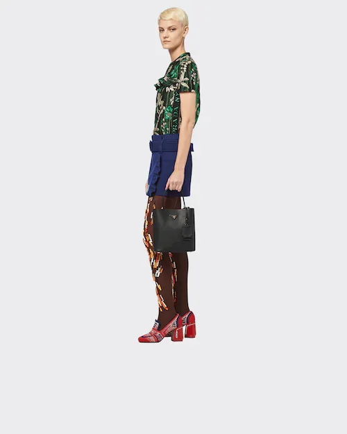 The elegant design of the Pra Panier bag is emphasized by the unmistakable texture of Saffiano leather. The bag has a detachable shoulder strap and an exclusive leather name tag with metal logo.