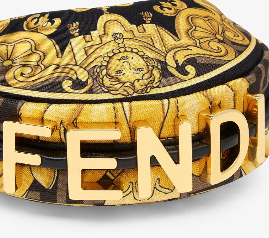 Nano Fdgraphy Hobo bag with zip fastening. embellished with vintage gold metal Fd lettering. The adjustable strap with a clip allows it to be attached to larger bags or worn on the wrist. Comes with hooks for the shoulder strap. Made of black silk with a multicolored Versace by Fd print. Born of the creative collaboration between the fashion houses. the graphics combine the iconic Fd FF logo with the Versace gold Baroque print. Gold-finish metalware.