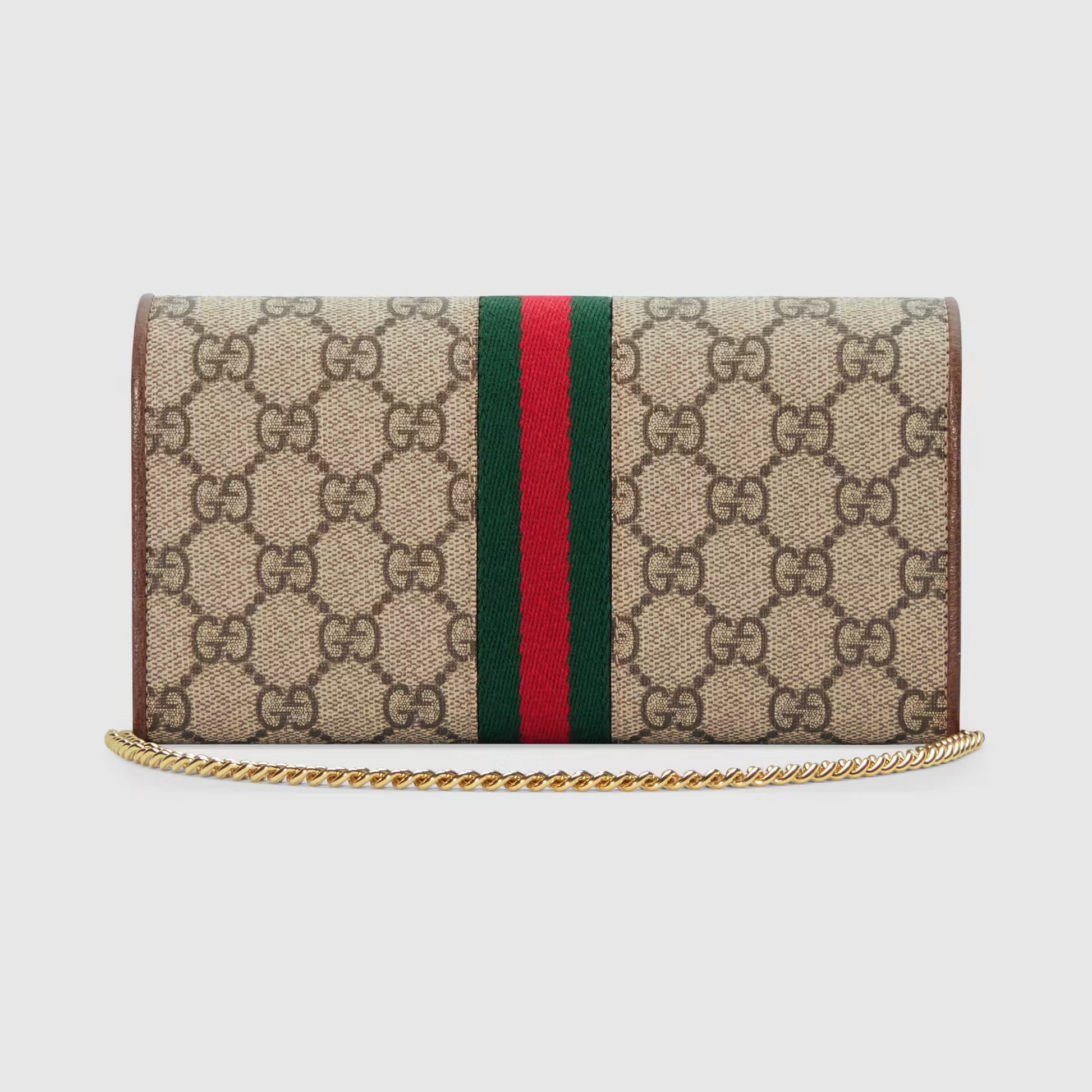 A classic combination of the House's most recognizable elements—the GG motif and Web stripe—the world of Ophidia continues to evolve. incorporating new shapes and silhouettes. The wallet has a compartmentalized construction and a removable chain strap that gives the structured shape dual functionality. allowing it to be worn as a mini bag.