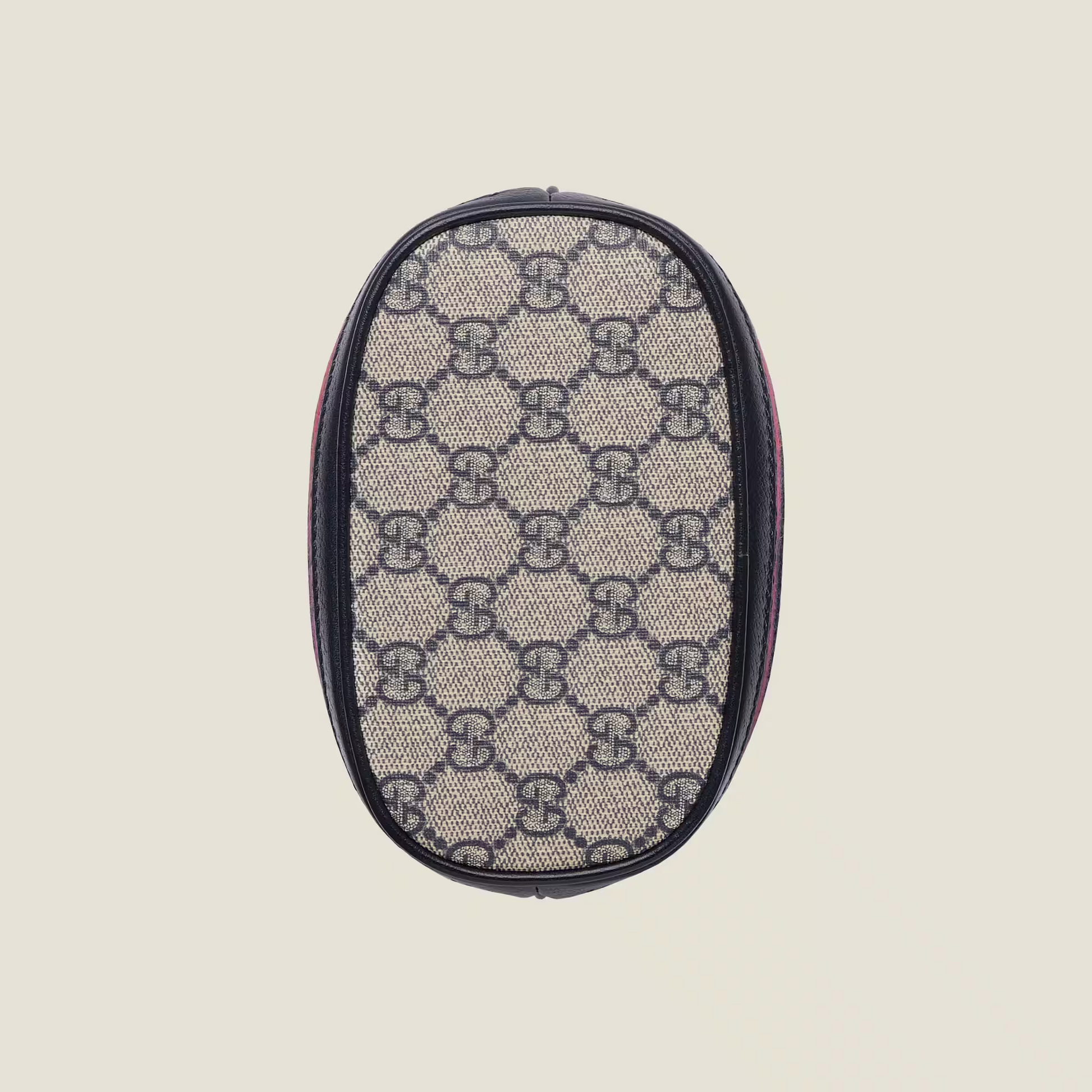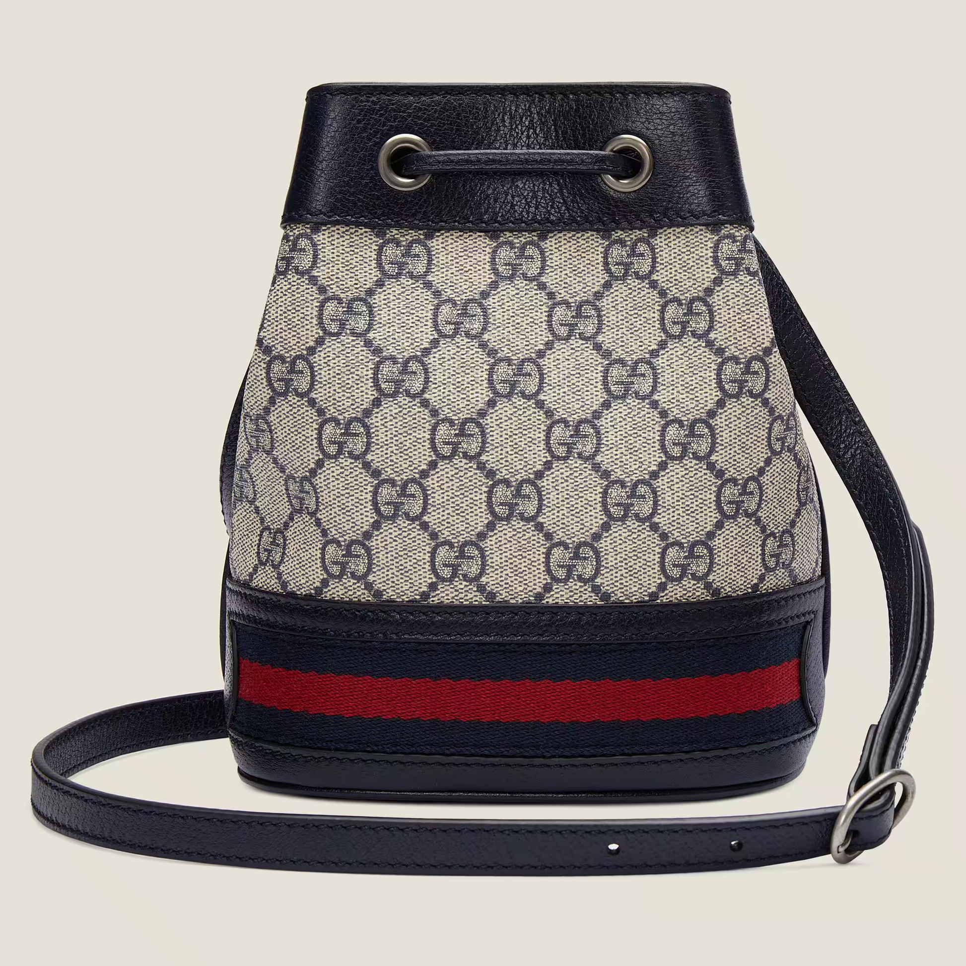 Mirroring the material's historic origins. GG Supreme is introduced in a timeless mix of blue and beige for GG Love Parade. The canvas has come to the forefront of each collection decade after decade to become a hallmark of the House. Here. the classic palette defines this mini bucket bag from the Ophidia line. combined with the Web in blue and red.