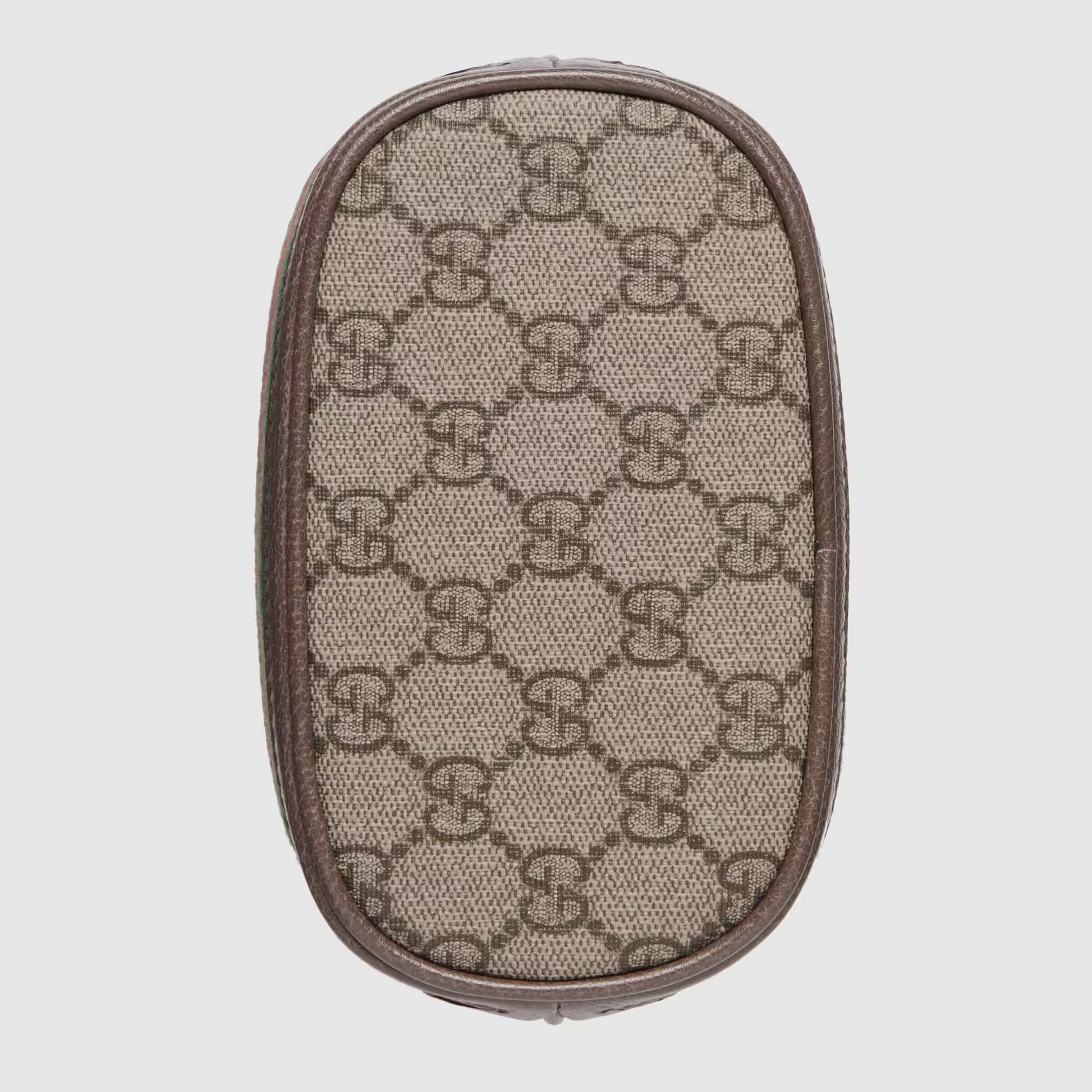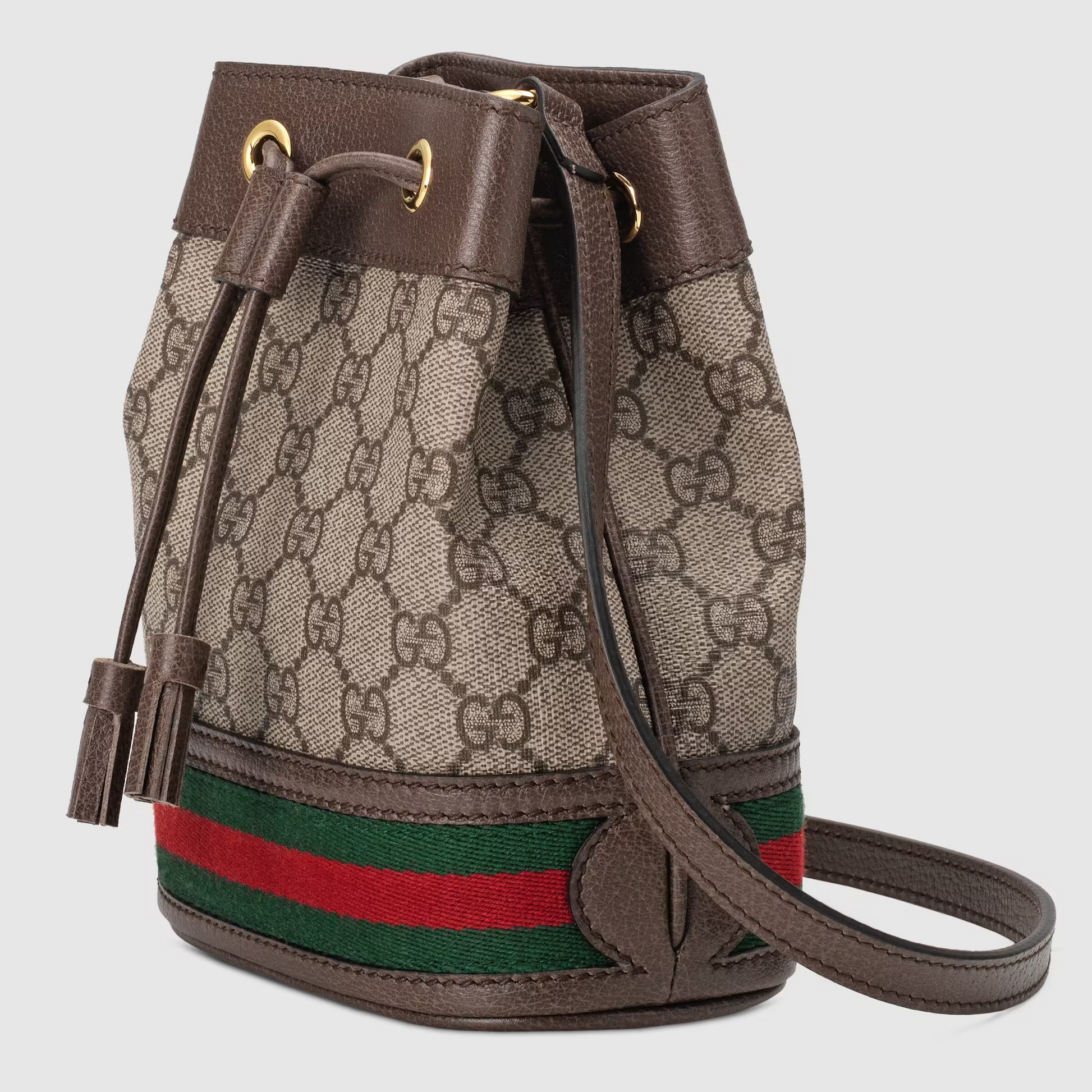 The world of Ophidia evolves with the introduction of a mini bucket bag shape. Crafted in GG Supreme canvas with inlaid green and red Web stripe along the bottom. the accessory is completed with an adjustable shoulder strap.
