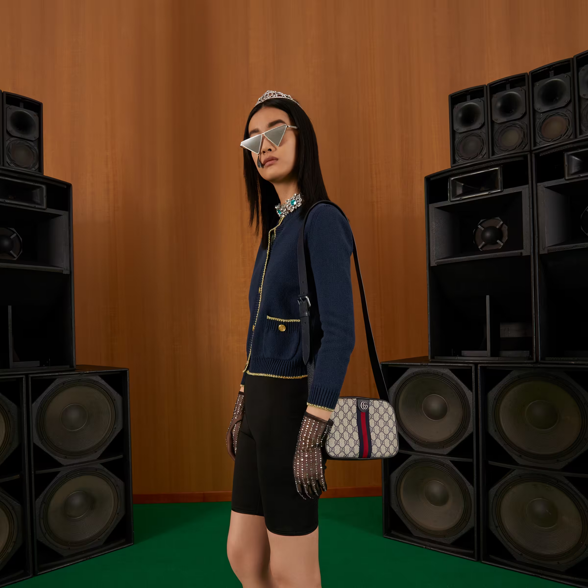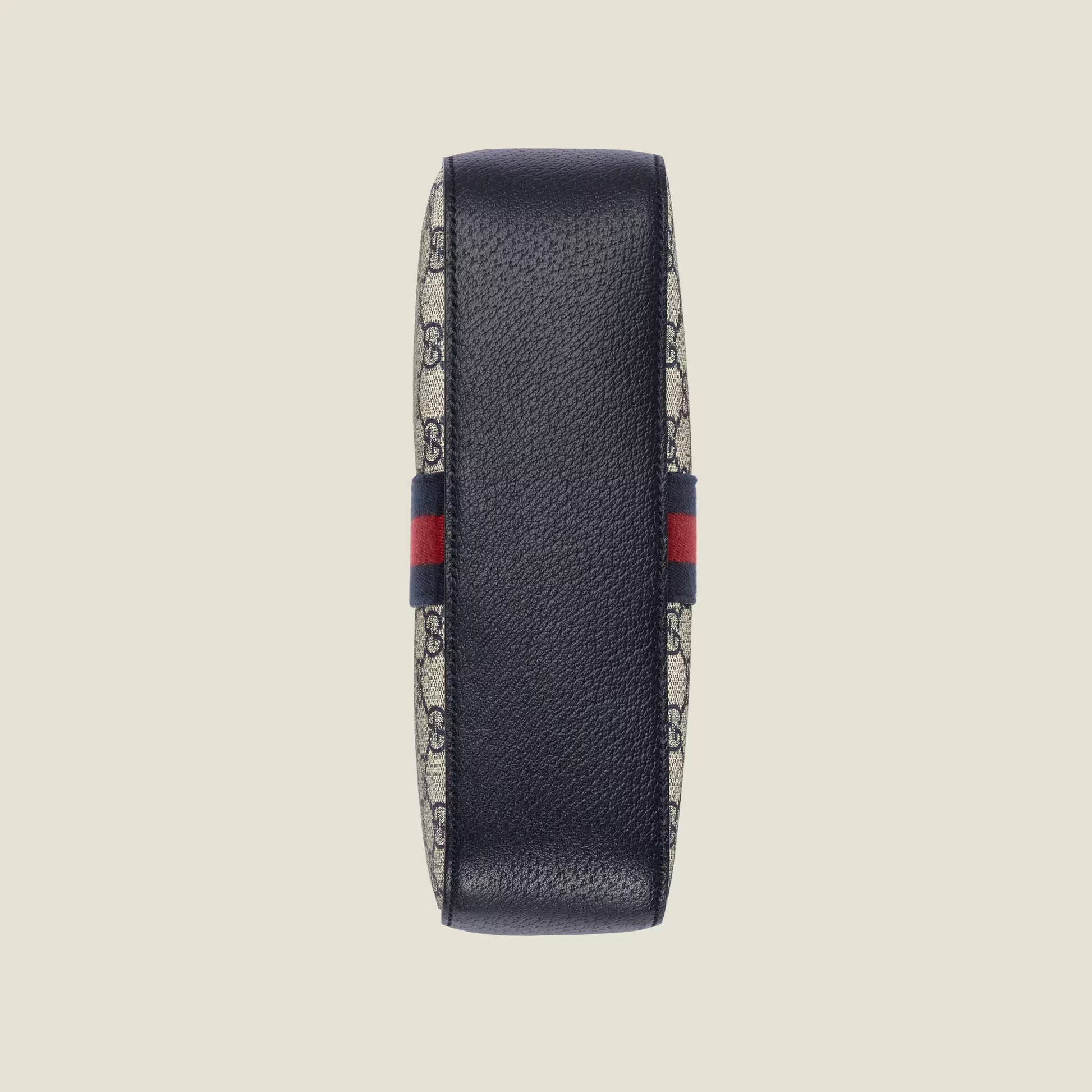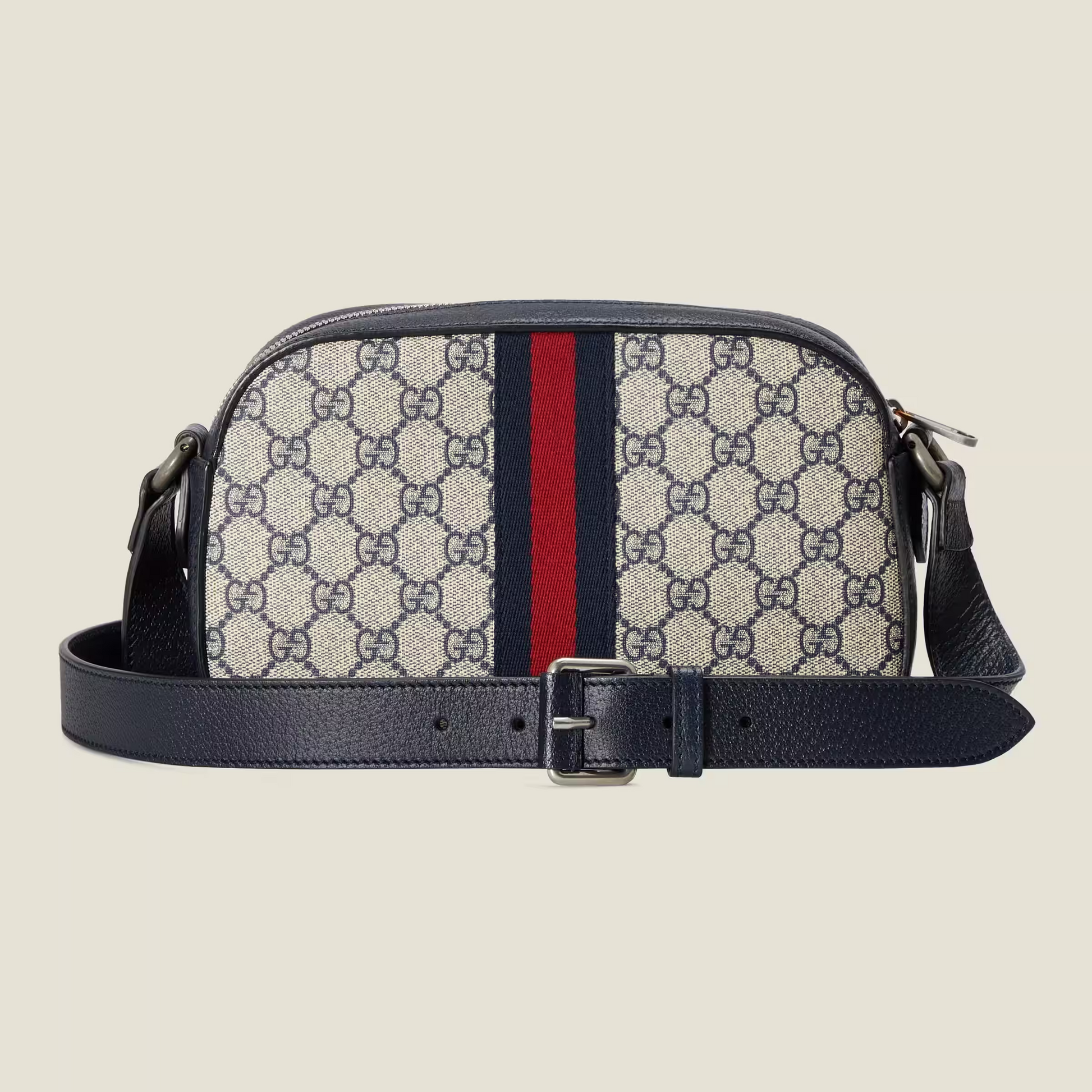 Mirroring the material's historic origins. GG Supreme is introduced in a timeless mix of blue and beige for GG Love Parade. The canvas has come to the front of each collection decade after decade to become a hallmark of the House. Here. the classic palette defines this Ophidia camera bag.