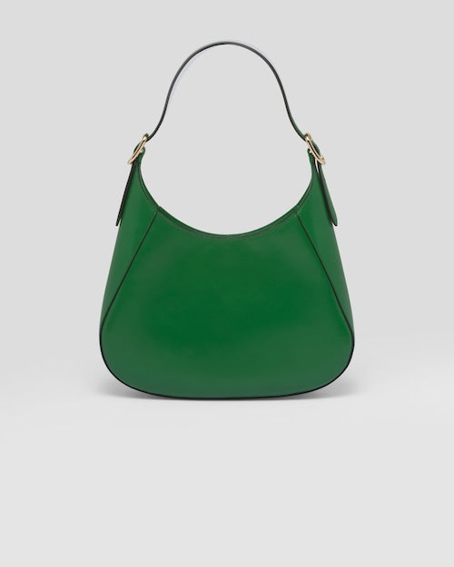 A bold and refined silhouette characterizes this leather shoulder bag with fine details. The geometric construction contrasts with soft lines to create a modern and elegant yet sporty bag. an expression of the hybrid concept and part of the Prada's aesthetic code.